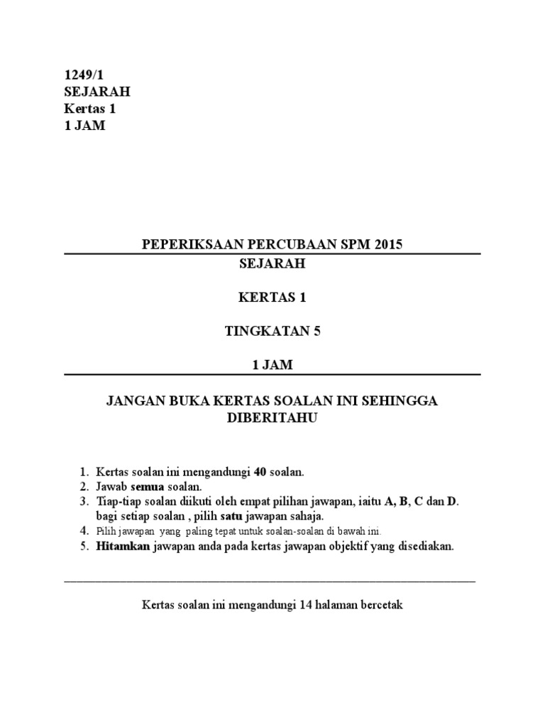 Pendidikan islam spm 2014 (kertas 1+2). Soalan percubaan sejarah spm 2015. Pihak sbub tidak menghiraukan kedudukan mat salleh sebagai pemerintah daerah spm 2015. Bahasa melayu (bm), sejarah, sejarah kertas 3, matematik, bahasa inggeris, fizik, kimia, matematik tambahan tema umum sejarah kertas 3 spm diumumkan oleh lembaga peperiksaan (kementerian pendidikan malaysia) pada bulan oktober. Soalan percubaan sejarah spm 2015.